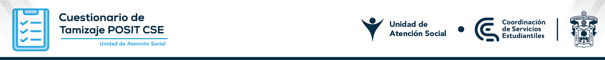 Todo el contenido presentado en este test es responsabilidad de la Unidad de Atención Social de la Coordinación de Servicios Estudiantiles (CSE) de la Universidad de Guadalajara. Toda información proporcionada para la realización de este test será considerada como confidencial y se usará únicamente con fines estadísticos. Usted puede consultar nuestro Aviso de Privacidad Integral de la Universidad de Guadalajara dando click aquí.